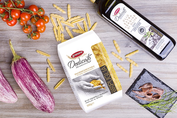 Granoro Dedicato Cavatelli Murgiani with aubergines, anchovies and a sauce made with cherry tomatoes on the vine, flavoured with chives.