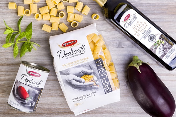 Granoro Dedicato Mezze Maniche with an aubergine and lemon balm ragoût