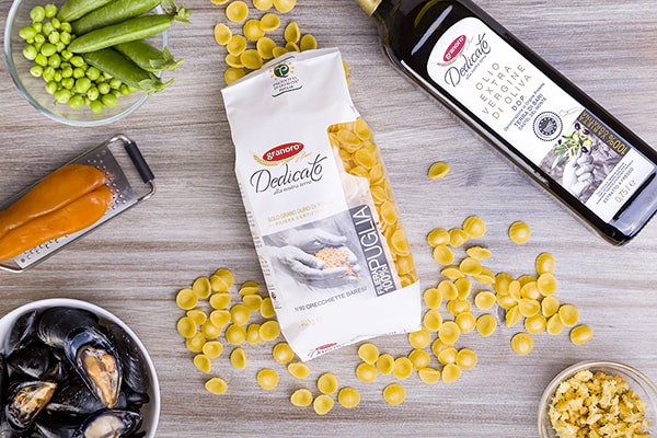 Granoro Dedicato Orecchiette Baresi with mussels, peas, bottarga and crispy, parsley flavoured bread.