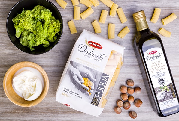 Granoro Dedicato Rigatoni with turnip greens and burrata cheese.