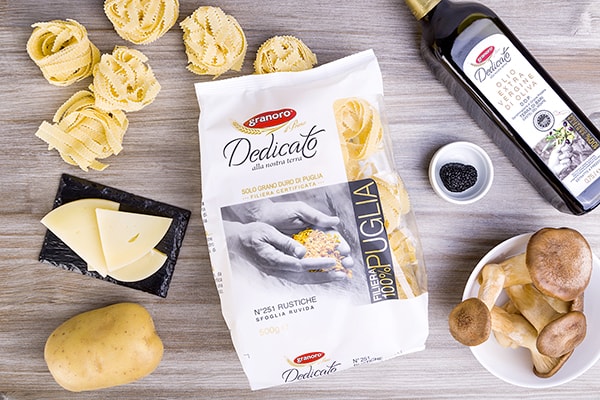 Fire-baked potato velouté with a heart of Granoro Dedicato Rustiche, cardoncelli mushrooms, caciocavallo cheese and truffle shavings.