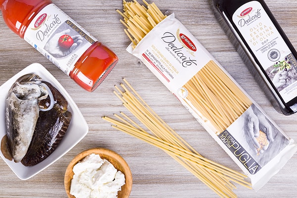 Granoro Dedicato Spaghetti alla Chitarra with ricotta-stuffed cuttlefish ragoût.
