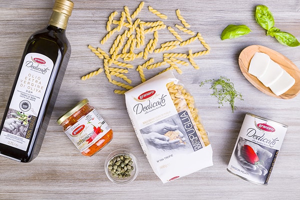 Granoro Dedicato Trofie with tomatoes, capers and cacioricotta cheese, flavoured with the Mediterranean herbs, basil and thyme.
