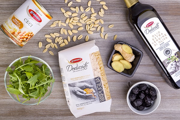Granoro Dedicato Gnocchetti Sardi with chick peas, olives, ginger and rocket