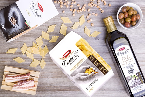 Granoro Dedicato Pantacce served with a soup of chick peas from Alta Murgia garnished with toasted pancetta and Cellina black olive powder